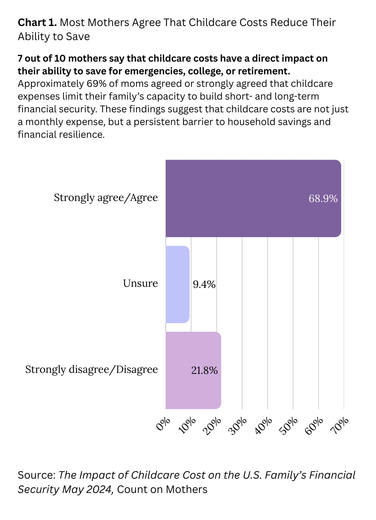 The Cost of Being a Family Is Increasingly Unsustainable. Across healthcare, childcare, food, and basic living expenses, families face costs that continue to rise faster than incomes. Childcare contributes to financial insecurity for over half of U.S. families, limiting the ability to save for emergencies, education, or retirement, while rising private insurance costs and administrative burdens are associated with delayed care and poorer health outcomes. Taken together, these findings point to a growing mismatch between the costs families face and the financial resources and protections available to them.